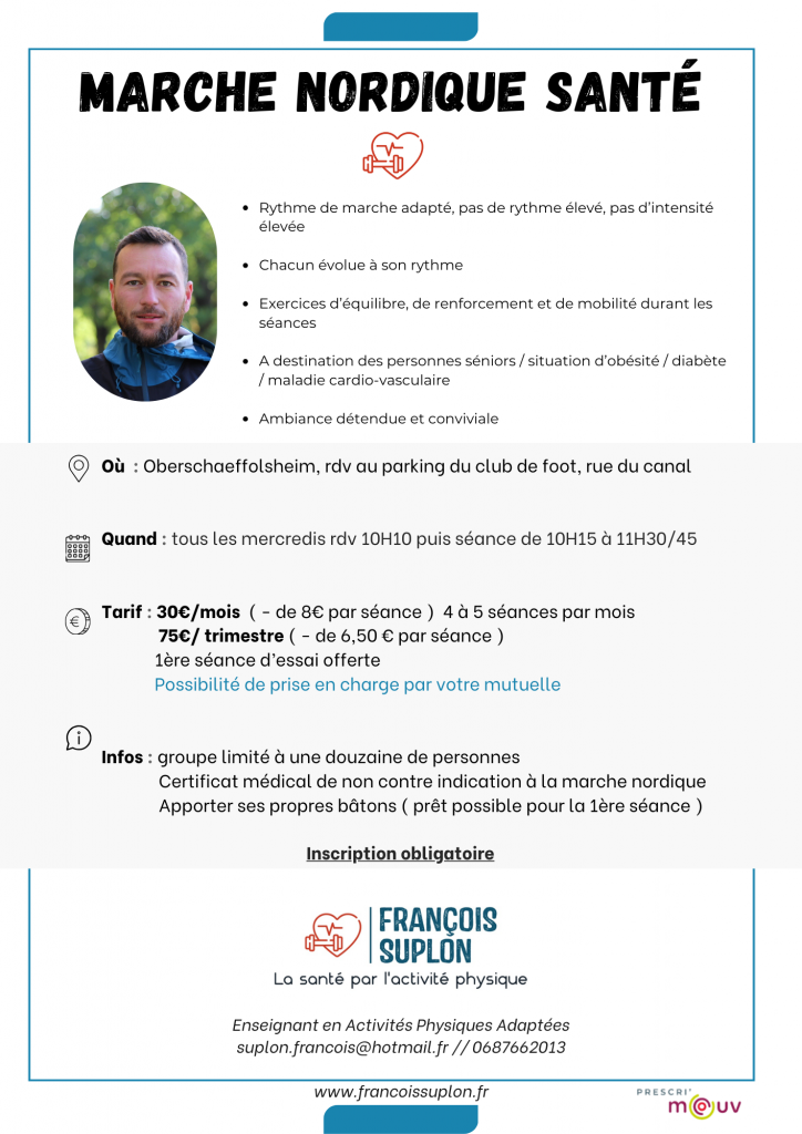 • Séance de marche nordique santé tous les mercredis matin de 10h15 à 11h30/45 au départ d’Oberschaeffolsheim.